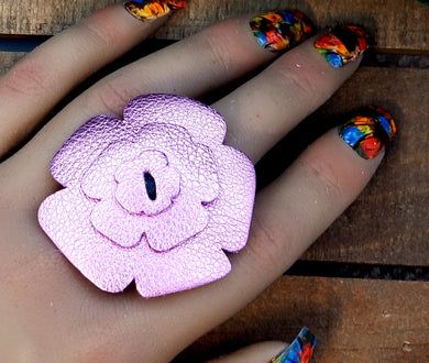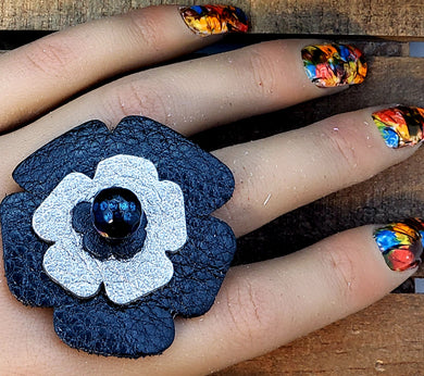 Leather Flower Ring - Metallic Black and Gray w/Precious Stone