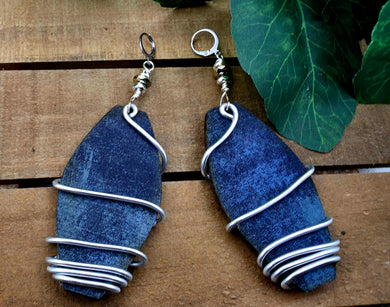 Small Groovy WOOD Dangles - Denim Print w/Beads
